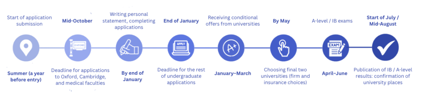 Поступающие должны до конца января подать заявления в пять выбранных университетов. Кандидаты, поступающие в Оксфорд, Кембридж или на медицинские курсы, проходят немного другой процесс, так как им необходимо сдать дополнительные экзамены, пройти собеседования и подать заявления раньше.